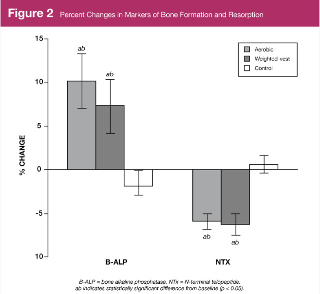 Roghani and colleagues assessed the effect of walking with and without weighted vests on markers of bone formation (Bone-Specific Alkaline Phosphatase; BALP) and resorption (NTx) (7). Participants (8 walkers, 9 weighted-vest walkers, 10 controls) were postmenopausal women with osteoporosis. The 6-week exercise program included three weekly 20-minute walks with or without a weighted vest at 50-60% maximal heart rate. Vest load progressively increased from 2% to 8% bodyweight. BALP levels increased and NTx levels decreased in both exercise groups with no significant differences between groups (Figure 2).