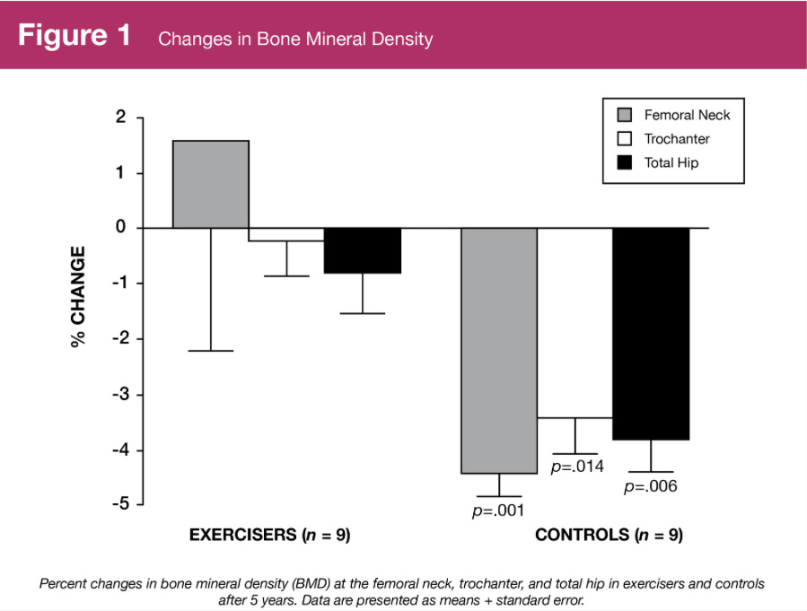This is the most commonly cited paper by folks who claim that weighted-vest walks improve BMD Snow and colleagues aimed to evaluate the long-term effects of weighted vest exercise on hip BMD in postmenopausal women (2). This was an extension of the Shaw study discussed above. A group of nine postmenopausal women exercised three days per week for 32 weeks of the year for five years, while a control group of nine did not. The exercise group performed squats, lunges, and jumps while wearing a weighted vest. The average weight of the vest was 11.3 lbs. BMD increased in the femoral neck in the exercise group, but not in the control group. BMD decreased in trochanter and total hip in both groups, but to a greater extent in the control group (Figure 1).