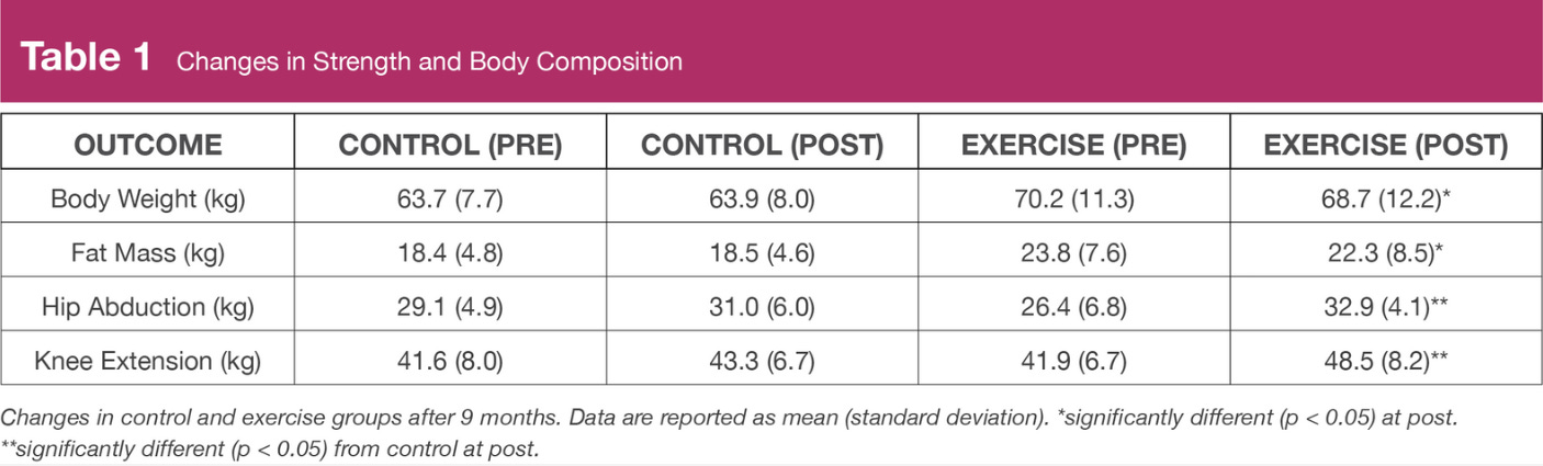 Shaw and colleagues assessed the effect of a nine-month exercise intervention on bone mineral density (BMD) and isokinetic strength (1). The study included an exercise group of 18 postmenopausal women who engaged in exercise and a control group (non-exercising group) of 22 postmenopausal women. The exercise program included stepping, squats, lunges, toe raises and jumps while wearing a weighted vest. Vest load progressively increased from 5% to 16-20% body weight. There were no significant changes in BMD in either group, but there were minor improvements in body composition and increased hip abduction and knee extension strength in the exercise group compared to the control group (Table 1).