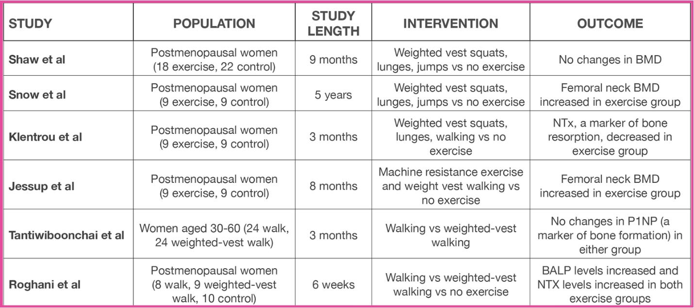 Tantiwiboonchai and colleagues compared the effects of walking with and without weighted vests on markers of bone formation and resorption (6). Participants (24 walkers and 24 weighted-vest walkers) were women aged 30-60. The 12-week exercise program included 3 weekly 30-minute walks with or without a weighted vest at 65-75% maximal heart rate. Vest load progressively increased from 2% to 8% bodyweight. β-crossLaps (a marker of bone resorption) decreased in both groups (walking: 0.357 + 0.168 to 0.279 + 0.137 ng/ml; weighted-vest walking: 0.350 + 0.227 to 0.283 + 0.132 ng/ml) with no significant differences between groups. There were no significant changes in P1NP (a marker of bone formation), fat mass or fat-free mass in either group.